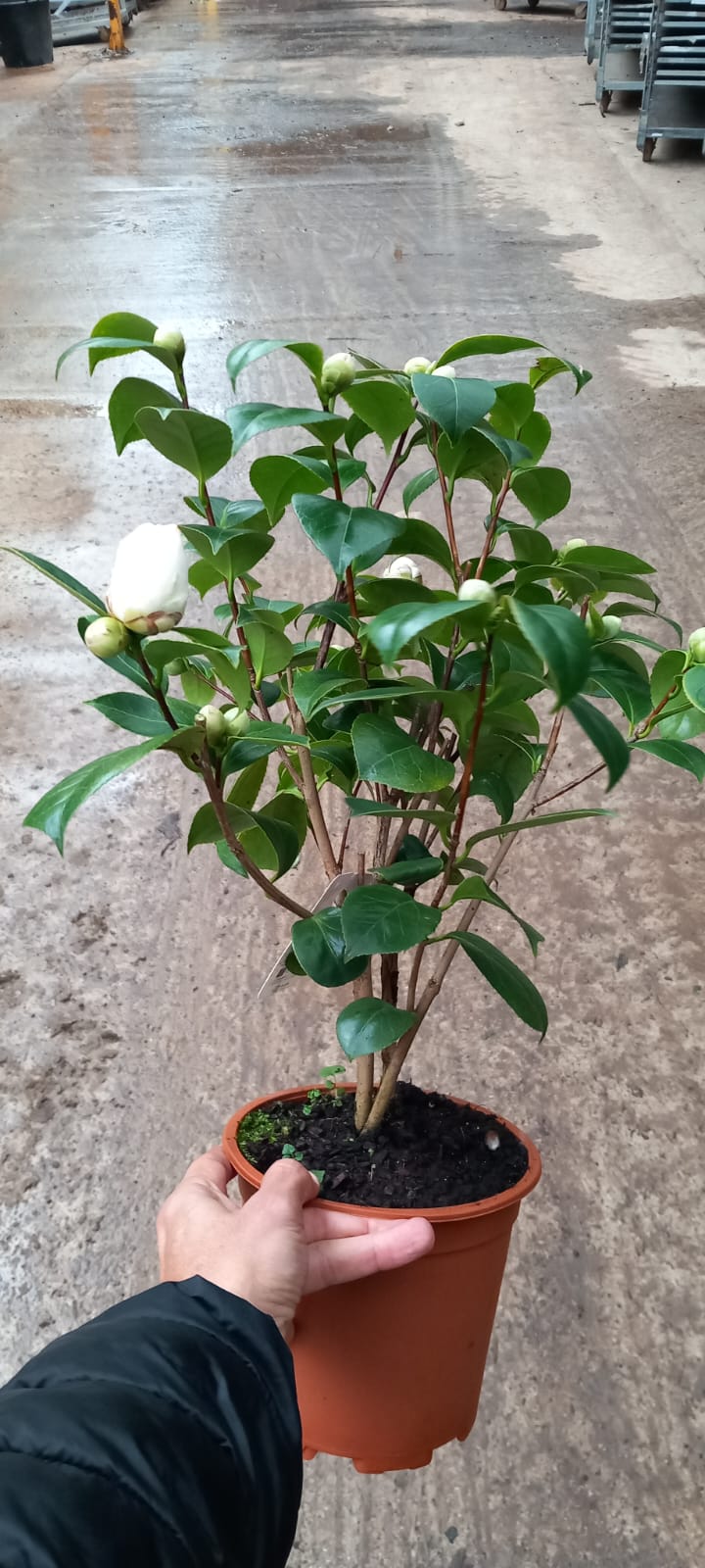 El arbusto de la camelia es perennifolio, por ello se mantiene bonito durante todo el año. Puede llegar a formar árboles de hasta 10 metros de altura. Se encuentra en jardines como planta individual o formando setos, y en grandes macetas para interiores. Las hojas son muy resistentes, de un tono verde oscuro y aspecto luminoso. Son anchas, con los bordes dentados y acabadas en punta. Por cada ápice de rama es posible que florezca una única flor de camelia. No poseen fragancia. Presentan un tamaño grande, los colores posibles son el blanco, rosa, rojo y cualquier combinación de éstas.